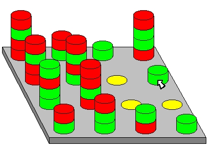 Beide Spieler, der Computer und Sie, setzen jeweils abwechselnd einen Stein auf das Spielbrett. Die Steine können auch zu einer Säule gestapelt werden, allerdings dürfen sich in einer Säule höchstens 4 Steine befinden.